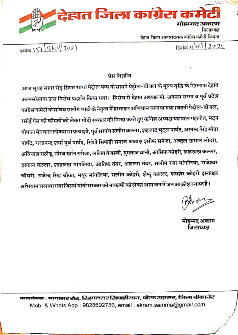 आज सुबह सागर रोड़ स्थित भारत पेट्रोल पम्प के सामने पेट्रोल - डीजल के मूल्य वृद्धि के खिलाफ देहात अल्पसंख्यक द्वारा विरोध प्रदर्शन किया गया । विरोध में देहात अध्यक्ष मो . अकरम सम्मा व पूर्व प्रदेश कांग्रेस कमेटी के सचिव सलीम भाटी के नेतृत्व में हस्ताक्षर अभियान चलाया गया।बढ़ती पेट्रोल - डीजल , रसोई गेस की कीमतों को लेकर मोदी सरकार की निन्दा करते हुए कांगेस अध्यक्ष यशपाल गहलोत , मदन गोपाल मेघवाल लोकसभा प्रत्याशी , पूर्व सरपंच सलीम कल्लर , शहजाद भुट्टा पार्षद , आनन्द सिंह सोढ़ा पार्षद , गजानन्द शर्मा पूर्व पार्षद , सिंधी सिपाही समाज अध्यक्ष शरीफ समेजा , अब्दुल रहमान लोदरा , अविनाश राठौड़ , नीरज खांन समेजा , ललित तेजस्वी , मुमताज बानो , आसिफ कोहरी , शाहरूख कल्लर , इरफान कल्लर , शाहरूख मांगलिया , आतिफ तंवर , अशलम तंवर , सलीम रजा मांगलिया , राजेश्वर चौधरी , राजेन्द्र सिंह बीका , मयूर मांगलिया , सलीम कोहरी , शैफू कल्लर , शमशेर कोहरी हस्ताक्षर अभियान चलाया गया जिसमें मोदी सरकार की नाकामी को लेकर आम जन में जन आक्रोश व्याप्त है
